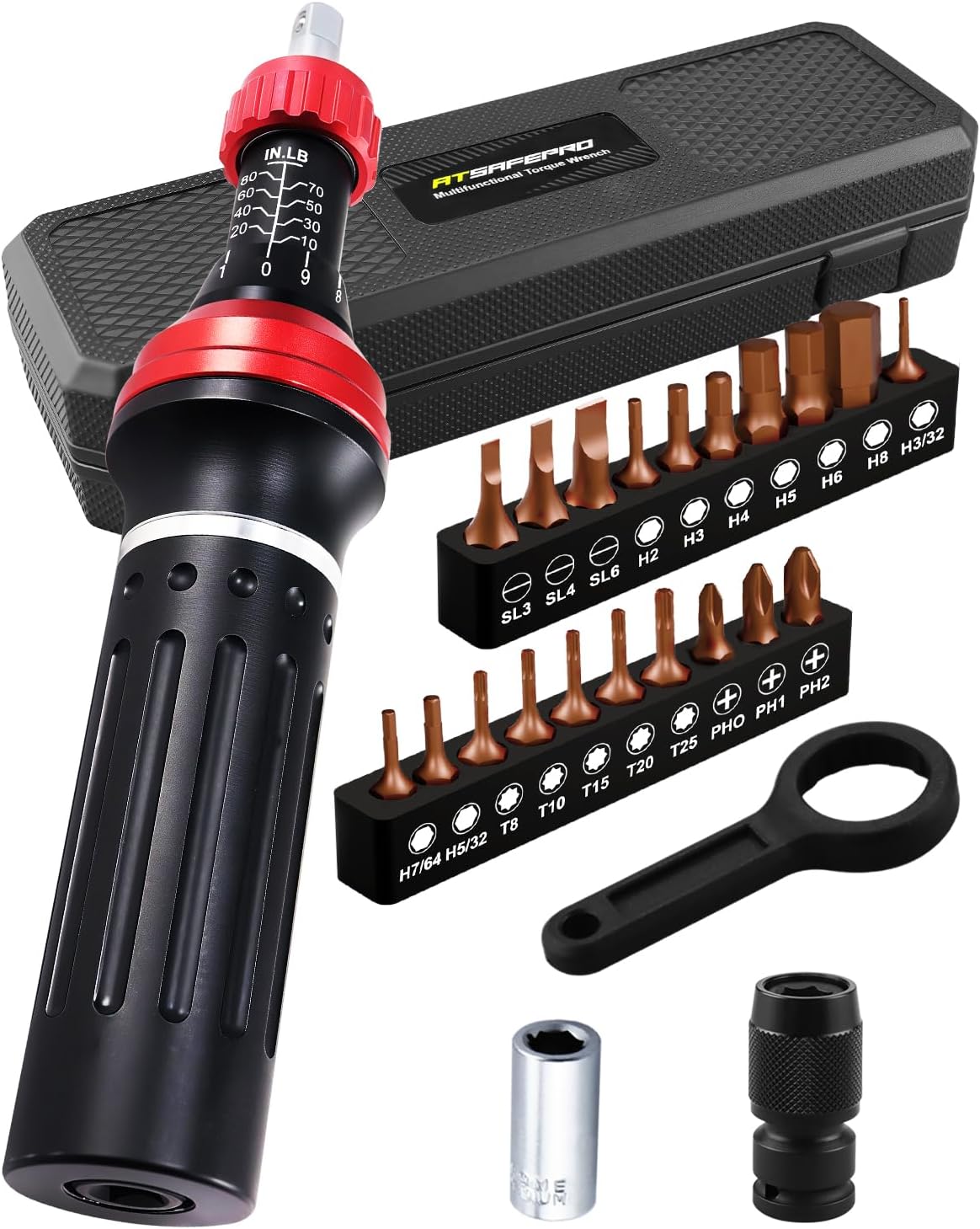Torque Screwdriver 10-80 in.lb, 1/4" Inch pound Torque Screwdriver Set, ±3% Accuracy, Includes 1/4" Bit Adapter, Flat, Hex, Torx and Philips Bits, Case & Calibration Certificate for Guns, Bike, DIY